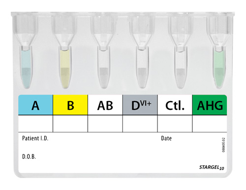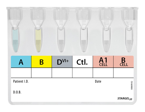 Tarjeta de gel para la determinación del grupo sanguíneo, ABO y Rh(D) de manera directa e inversa. Diseñada especialmente para pacientes.