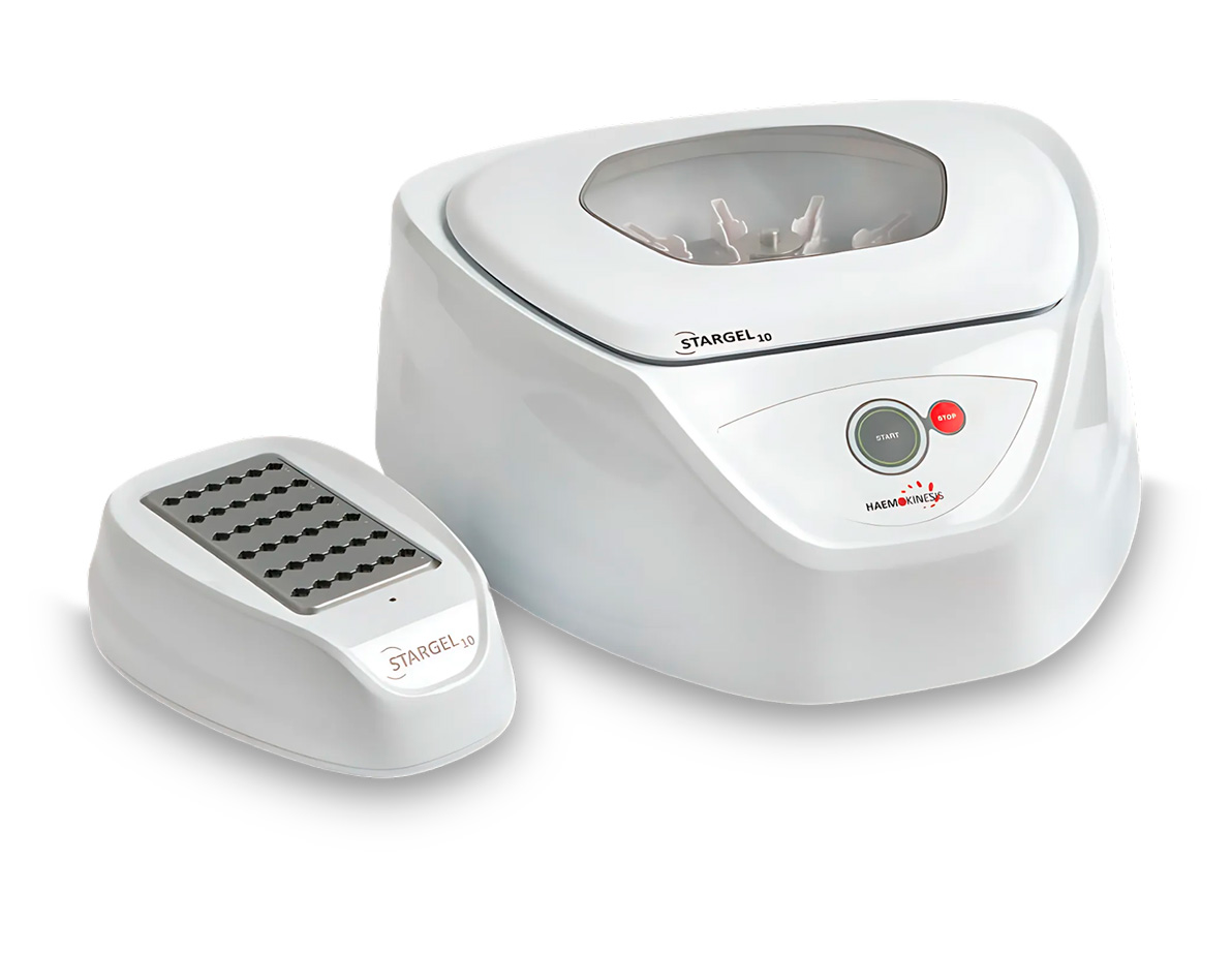 Centrífuga de mesa, no refrigerada, con capacidad para procesar hasta 12 tarjetas STARGEL10 de manera simultánea.