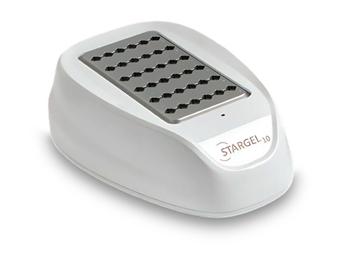 Incubador de mesa, con capacidad para procesar hasta 6 tarjetas STARGEL10 de manera simultánea. Se puede conectar al puerto de alimentación de la centrífuga.